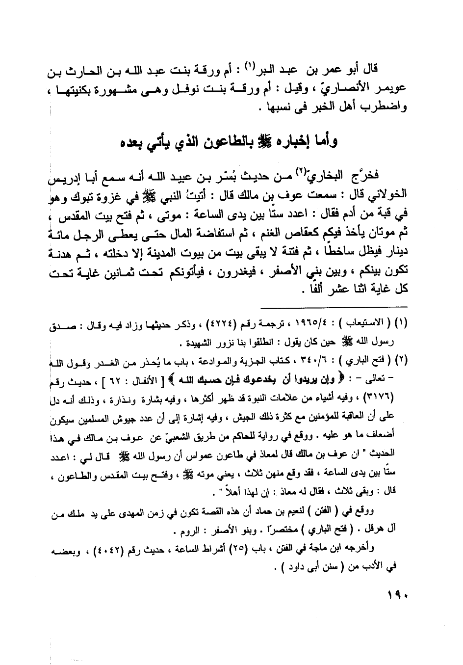 فخرّج البخاريّ [ (2) ] من حديث بسر بن عبيد اللَّه أنه سمع أبا إدريس الخولانيّ قال: سمعت عوف بن مالك قال: أتيت النبي صلّى اللَّه عليه وسلّم في غزوة تبوك وهو في قبة من أدم فقال: اعدد ستا بين يدي الساعة: موتى، ثم فتح بيت المقدس، ثم موتان يأخذ فيكم كعقاص الغنم، ثم استفاضة المال حتى يعطى الرجل مائة دينار فيظل ساخطا، ثم فتنة لا يبقى بيت من بيوت المدينة إلا دخلته، ثم هدنة تكون بينكم، وبين بني الأصفر، فيغدرون، فيأتونكم تحت ثمانين غاية تحت كل غاية اثنا عشر ألفا.