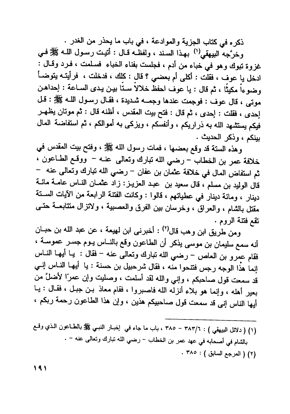 [ (1) ] (دلائل البيهقي) : 6/ 383- 385، باب ما جاء في إخبار النبي صلّى اللَّه عليه وسلّم بالطاعون الّذي وقع بالشام في أصحابه في عهد عمر بن الخطاب- رضي اللَّه تبارك وتعالى عنه-.
