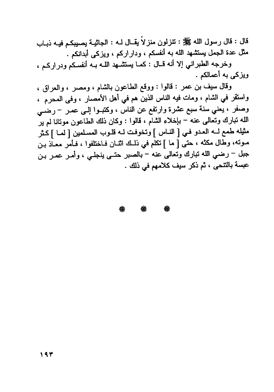 وقال سيف بن عمر: قالوا: ووقع الطاعون بالشام، ومصر، والعراق، واستقر في الشام، ومات فيه الناس الذين هم في أهل الأمصار، وفي المحرم، وصفر، يعني سنة سبع عشرة وارتفع عن الناس، وكتبوا إلى عمر- رضي اللَّه تبارك وتعالى عنه- بإخلاء الشام، قالوا: وكان ذلك الطاعون موتانا لم ير مثيله طمع له العدو في [الناس] وتخوفت له قلوب المسلمين [لما] كثر موته، وطال مكثه، حتى [ما] تكلم في ذلك اثنان فاختلفوا، فأمر معاذ بن جبل- رضي اللَّه تبارك وتعالى عنه- بالصبر حتى ينجلي، وأمر عمر بن عبسة بالتنحي، ثم ذكر سيف كلامهم في ذلك.