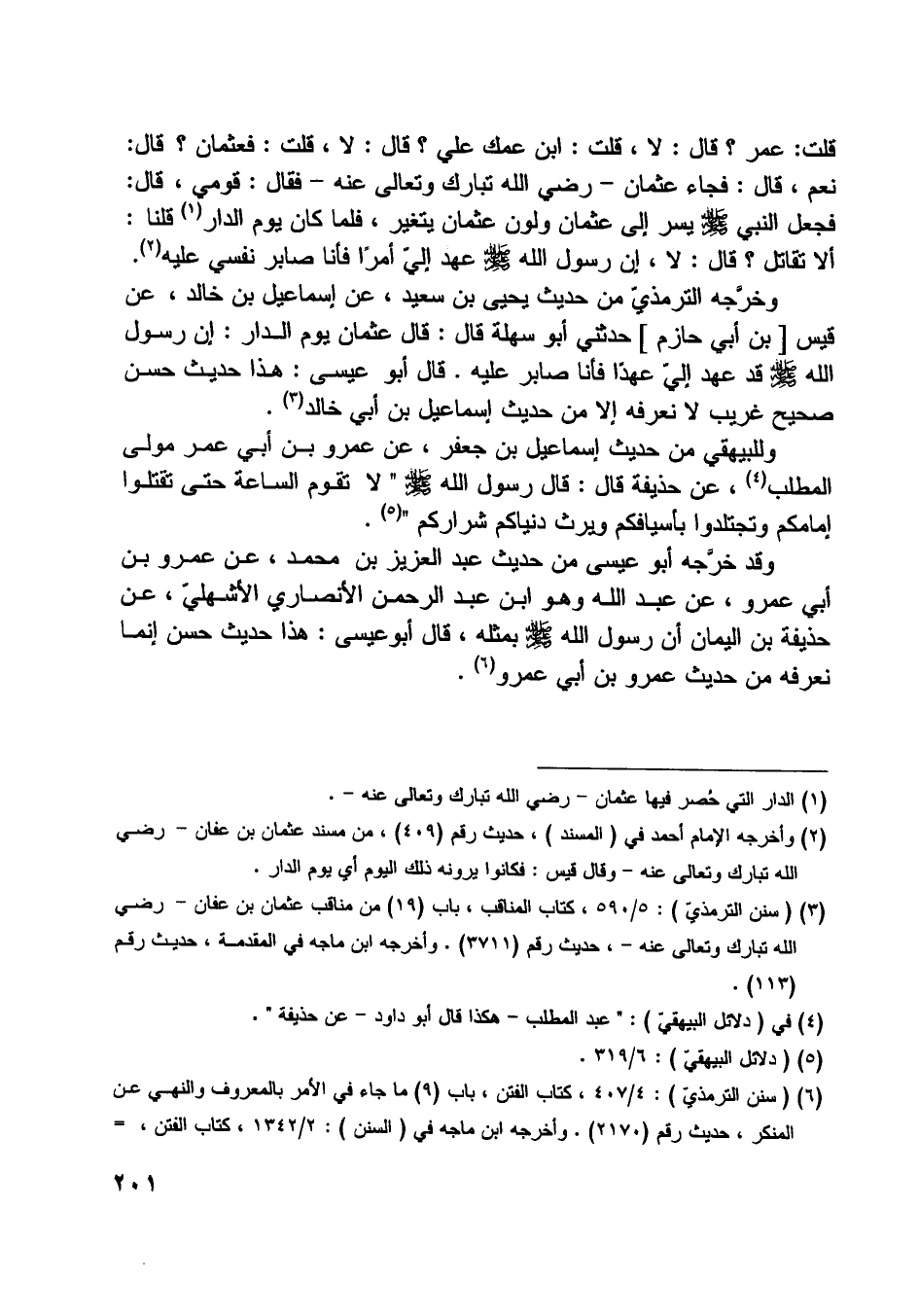 [ (2) ] وأخرجه الإمام أحمد في (المسند) ، حديث رقم (409) ، من مسند عثمان بن عفان- رضي اللَّه تبارك وتعالى عنه- وقال قيس: فكانوا يرونه ذلك اليوم أي يوم الدار.