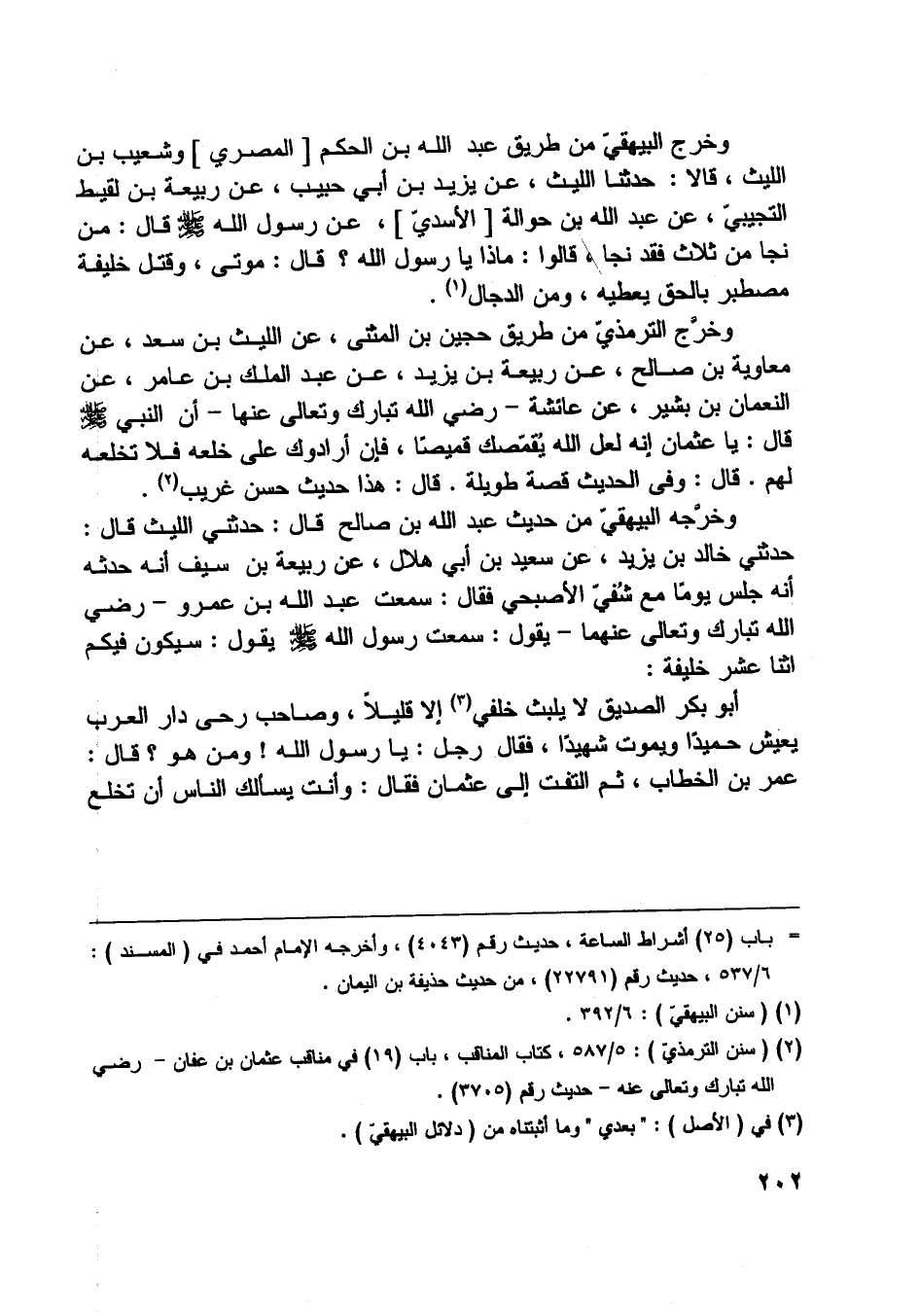 وخرج البيهقيّ من طريق عبد اللَّه بن الحكم [المصري] وشعيب بن الليث، قالا: حدثنا الليث، عن يزيد بن أبي حبيب، عن ربيعة بن لقيط التجيبيّ، عن عبد اللَّه بن حوالة [الأسديّ] ، عن رسول اللَّه صلّى اللَّه عليه وسلّم قال: من نجا من ثلاث فقد نجا، قالوا: ماذا يا رسول اللَّه؟ قال: موتى، وقتل خليفة مصطبر بالحق يعطيه، ومن الدجال [ (1) ] .