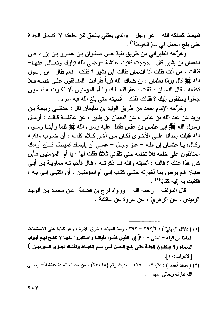 [ (1) ] (دلائل البيهقيّ) : 6/ 392- 393، وسمّ الخياط: خرق الإبرة، وهو كناية على الاستحالة، اقتباسا من قوله- تعالى-: إِنَّ الَّذِينَ كَذَّبُوا بِآياتِنا وَاسْتَكْبَرُوا عَنْها لا تُفَتَّحُ لَهُمْ أَبْوابُ السَّماءِ وَلا يَدْخُلُونَ الْجَنَّةَ حَتَّى يَلِجَ الْجَمَلُ فِي سَمِّ الْخِياطِ وَكَذلِكَ نَجْزِي الْمُجْرِمِينَ [الأعراف: 40] .