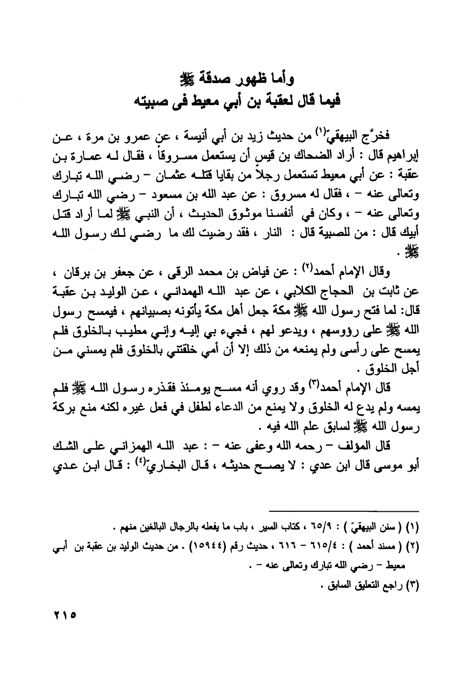 وأما ظهور صدقة صلّى اللَّه عليه وسلّم فيما قال لعقبة بن أبي معيط في صبيته