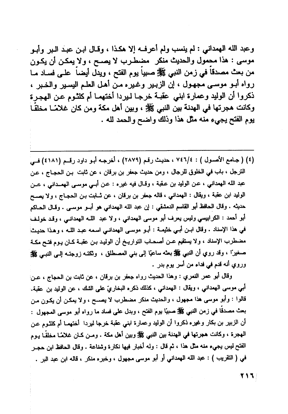 أن الزبير بن بكار وغيره ذكروا أن الوليد وعمارة ابني عقبة خرجا ليردا أختهما أم كلثوم عن الهجرة، وكانت هجرتها في الهدنة بين النبي صلّى اللَّه عليه وسلّم وبين أهل مكة. ومن كان غلاما مخلقا يوم الفتح ليس يجيء منه مثل هذا، ثم قال: وله أخبار فيها نكارة وشناعة. وقال الحافظ ابن حجر في (التقريب) : عبد اللَّه الهمدانيّ أو أبو موسى مجهول، وخبره منكر، قاله ابن عبد البر.