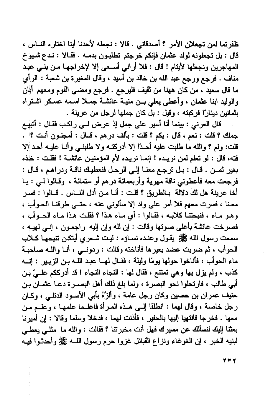 فرجعت معه فأعطوني ناقة مهرية وأربعمائة درهم أو ستمائة، وقالوا لي: يا أخا عرينة هل لك دلالة بالطريق؟ قلت: أنا من أدل الناس. قالوا: فسر معنا، فسرت معهم فلا أمر على واد إلا سألوني عنه، حتى طرقنا الحوأب، وهو ماء، فنبحتنا كلابه، فقالوا: أي ماء هذا؟ فقلت هذا ماء الحوأب، فصرخت عائشة بأعلى صوتها