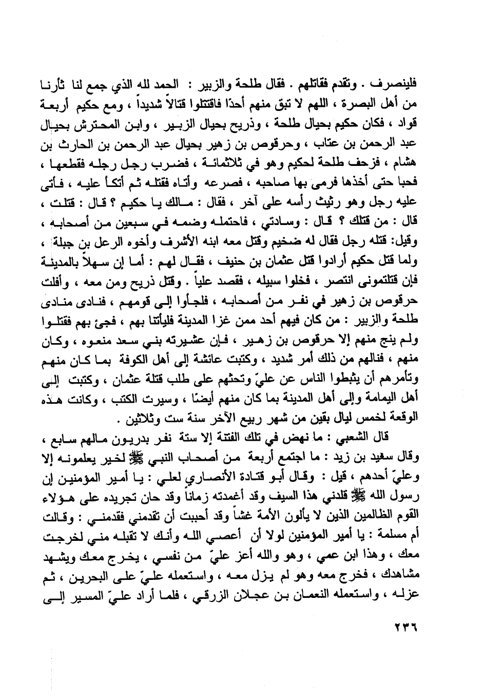فلينصرف. وتقدم فقاتلهم. فقال طلحة والزبير: الحمد للَّه الّذي جمع لنا ثأرنا من أهل البصرة، اللَّهمّ لا تبق منهم أحدا فاقتتلوا قتالا شديدا، ومع حكيم أربعة قواد، فكان حكيم بحيال طلحة، وذريح بحيال الزبير، وابن المحترش بحيال عبد الرحمن بن عتاب، وحرقوص بن زهير بحيال عبد الرحمن بن الحارث بن هشام، فزحف طلحة لحكيم وهو في ثلاثمائة، فضرب رجل رجله فقطعها، فحبا حتى أخذها فرمى بها صاحبه، فصرعه وأتاه فقتله ثم اتكأ عليه، فأتى عليه رجل وهو رثيث رأسه على آخر، فقال: ما لك يا حكيم؟ قال: قتلت، قال: من قتلك؟ قال: وسادتي، فاحتمله وضمه في سبعين من أصحابه، وقيل: قتله رجل فقال له ضخيم وقتل معه ابنه الأشرف وأخوه الرعل بن جبلة، ولما قتل حكيم أرادوا قتل عثمان بن حنيف، فقال لهم: أما إن سهلا بالمدينة فإن قتلتموني انتصر، فخلوا سبيله، فقصد عليا. وقتل ذريح ومن معه، وأفلت حرقوص بن زهير في نفر من أصحابه، فلجئوا إلى قومهم، فنادى منادى طلحة والزبير: من كان فيهم أحد ممن غزا المدينة فليأتنا بهم، فجيء بهم فقتلوا ولم ينج منهم إلا حرقوص بن زهير، فإن عشيرته بني سعد منعوه، وكان منهم، فنالهم من ذلك أمر شديد، وكتبت عائشة إلى أهل الكوفة بما كان منهم وتأمرهم أن يثبطوا الناس عن علي وتحثهم على طلب قتلة عثمان، وكتبت إلى أهل اليمامة وإلى أهل المدينة بما كان منهم أيضا، وسيرت الكتب، وكانت هذه الوقعة لخمس ليال بقين من شهر ربيع الآخر سنة ست وثلاثين.