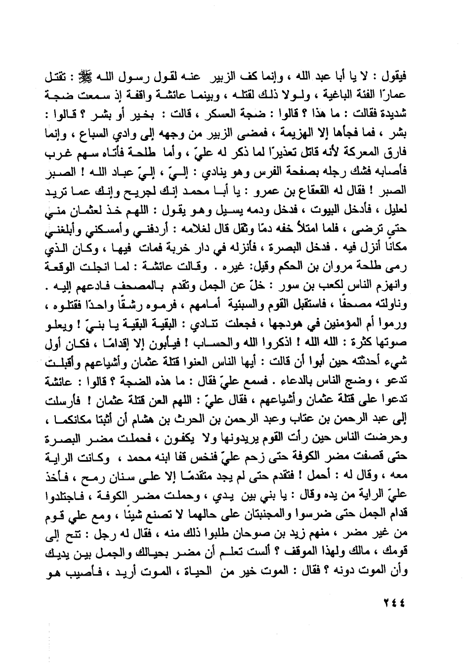 ولولا ذلك لقتله، وبينما عائشة واقفة إذ سمعت ضجة شديدة فقالت: ما هذا؟ قالوا: ضجة العسكر، قالت: بخير أو بشر؟ قالوا: