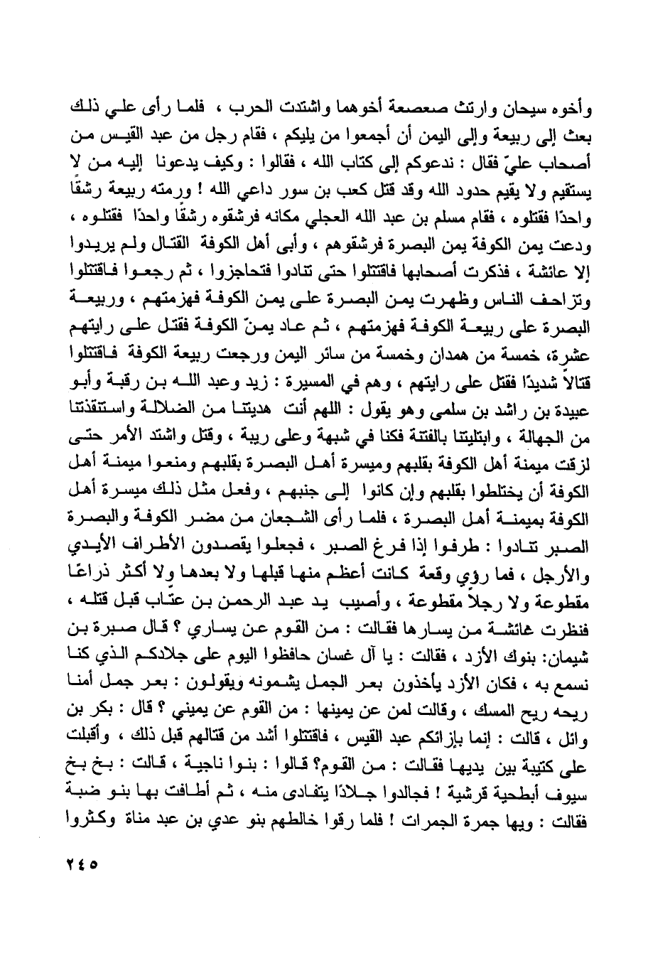 وأخوه سيحان وارتث صعصعة أخوهما واشتدت الحرب، فلما رأى علي ذلك بعث إلى ربيعة وإلى اليمن أن أجمعوا من يليكم، فقام رجل من عبد القيس من أصحاب عليّ فقال: ندعوكم إلى كتاب اللَّه، فقالوا: وكيف يدعونا إليه من لا يستقيم ولا يقيم حدود اللَّه وقد قتل كعب بن سور داعي اللَّه! ورمته ربيعة رشقا واحدا فقتلوه، فقام مسلم بن عبد اللَّه العجليّ مكانه فرشقوه رشقا واحدا فقتلوه، ودعت يمن الكوفة يمن البصرة فرشقوهم، وأبى أهل الكوفة القتال ولم يريدوا إلا عائشة، فذكرت أصحابها فاقتتلوا حتى تنادوا فتحاجزوا، ثم رجعوا فاقتتلوا وتزاحف الناس وظهرت يمن البصرة على يمن الكوفة فهزمتهم، وربيعة البصرة على ربيعة الكوفة فهزمتهم، ثم عاد يمنّ الكوفة فقتل على رايتهم عشرة، خمسة من همدان وخمسة من سائر اليمن ورجعت ربيعة الكوفة فاقتتلوا قتالا شديدا فقتل على رايتهم، وهم في المسيرة: زيد وعبد اللَّه بن رقبة وأبو عبيدة بن راشد بن سلمى وهو يقول: اللَّهمّ أنت هديتنا من الضلالة واستنقذتنا من الجهالة، وابتليتنا بالفتنة فكنا في شبهة وعلى ريبة، وقتل واشتد الأمر حتى لزقت ميمنة أهل الكوفة بقلبهم وميسرة أهل البصرة بقلبهم ومنعوا ميمنة أهل الكوفة بميمنة أهل البصرة، فلما رأى الشجعان من مضر الكوفة والبصرة الصبر تنادوا: طرفوا إذا فرغ الصبر، فجعلوا يقصدون الأطراف الأيدي والأرجل، فما رئي وقعة كانت أعظم منها قبلها ولا بعدها ولا أكثر ذراعا مقطوعة ولا رجلا مقطوعة، وأصيب يد عبد الرحمن بن عتّاب قبل قتله، فنظرت عائشة من يسارها فقالت: من القوم عن يساري؟ قال صبرة بن شيمان: بنوك الأزد، فقالت: يا آل غسان حافظوا اليوم على جلادكم الّذي كنا نسمع به، فكان الأزد يأخذون بعر الجمل يشمونه ويقولون: بعر جمل أمنا ريحه ريح المسك، وقالت لمن عن يمينها: من القوم عن يميني؟ قال: بكر بن وائل، قالت: إنما بإزائكم عبد القيس، فاقتتلوا أشد من قتالهم قبل ذلك، وأقبلت على كتيبة بين يديها فقالت: من القوم؟ قالوا: بنوا ناجية، قالت: بخ بخ سيوف أبطحية قرشية! فجالدوا جلادا يتفادى منه، ثم أطافت بها بنو ضبة فقالت: ويها جمرة الجمرات! فلما رقوا خالطهم بنو عدي بن عبد مناة وكثروا