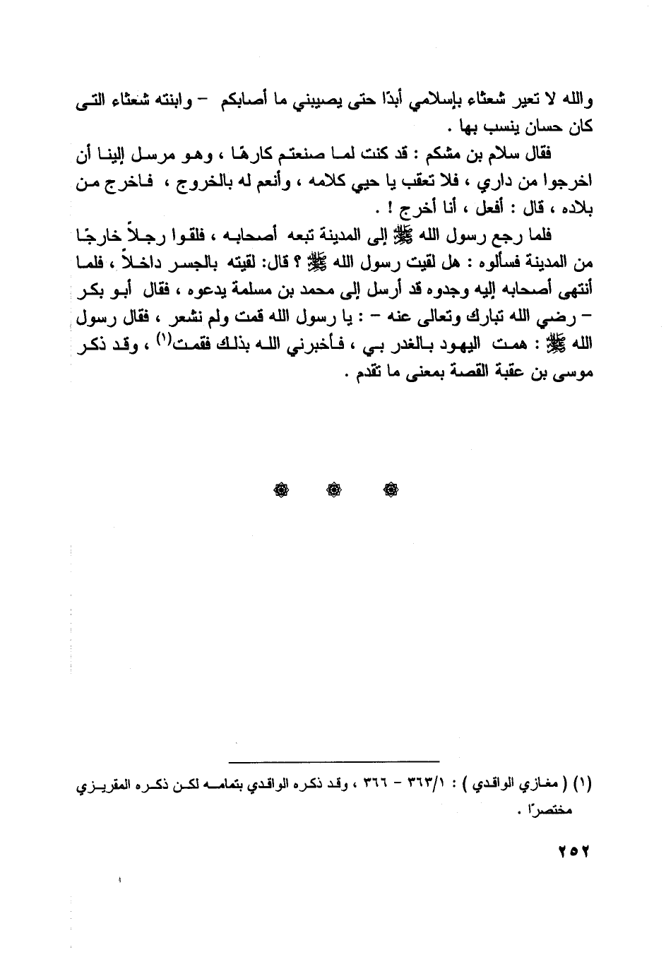 فقال سلام بن مشكم: قد كنت لما صنعتم كارها، وهو مرسل إلينا أن اخرجوا من داري، فلا تعقب يا حيي كلامه، وأنعم له بالخروج، فاخرج من بلاده، قال: أفعل، أنا أخرج! فلما رجع رسول اللَّه صلّى اللَّه عليه وسلّم إلى المدينة تبعه أصحابه، فلقوا رجلا خارجا من المدينة فسألوه: هل لقيت رسول اللَّه صلّى اللَّه عليه وسلّم؟ قال: لقيته بالجسر داخلا، فلما انتهى أصحابه إليه وجدوه قد أرسل إلى محمد بن مسلمة يدعوه،
