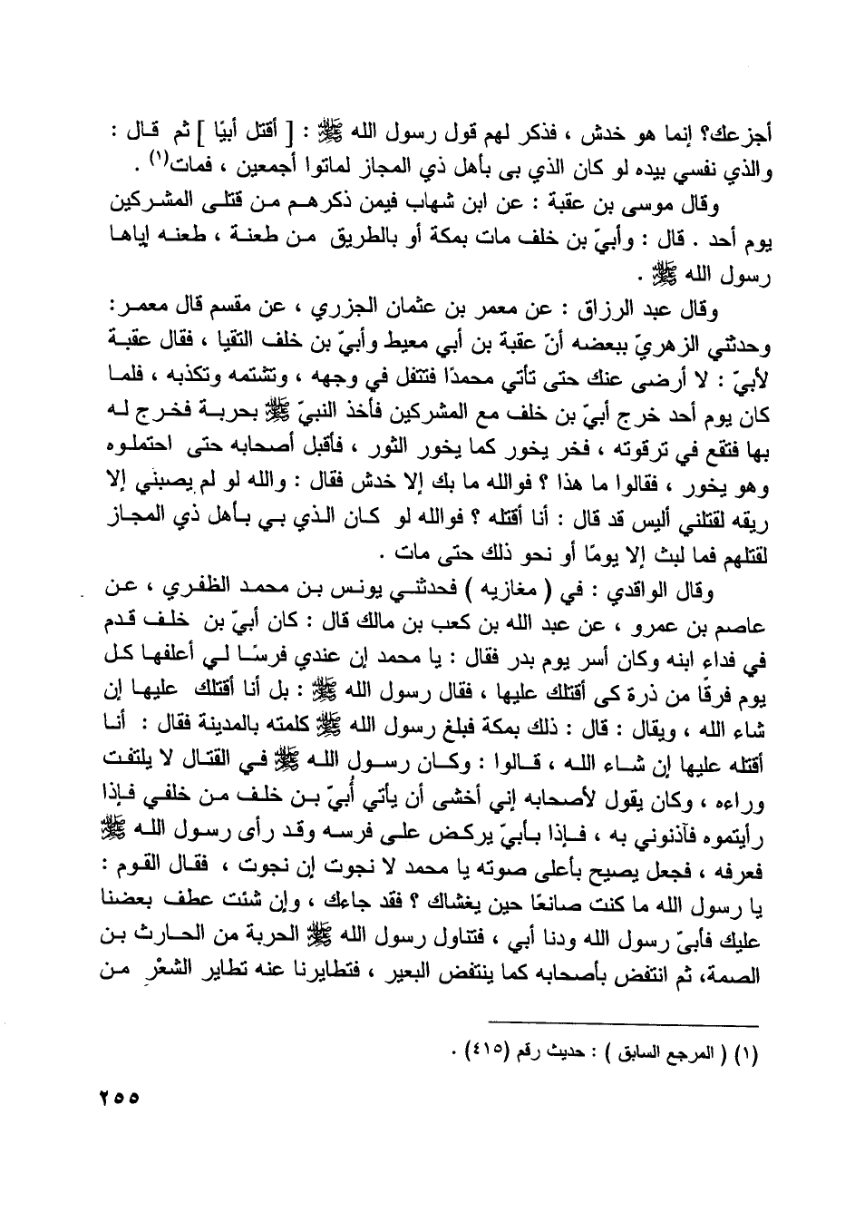 وقال الواقدي: في (مغازيه) فحدثني يونس بن محمد الظفري، عن عاصم بن عمرو، عن عبد اللَّه بن كعب بن مالك قال: كان أبيّ بن خلف قدم في فداء ابنه وكان أسر يوم بدر فقال: يا محمد إن عندي فرسا لي أعلفها كل يوم فرقا من ذرة كي أقتلك عليها، فقال رسول اللَّه صلّى اللَّه عليه وسلّم: بل أنا أقتلك عليها إن شاء اللَّه، ويقال: قال: ذلك بمكة فبلغ رسول اللَّه صلّى اللَّه عليه وسلّم كلمته بالمدينة فقال: أنا أقتله عليها إن شاء اللَّه، قالوا: وكان رسول اللَّه صلّى اللَّه عليه وسلّم في القتال لا يلتفت وراءه، وكان يقول لأصحابه إني أخشى أن يأتي أبيّ بن خلف من خلفي فإذا رأيتموه فآذنوني به، فإذا بأبيّ يركض على فرسه وقد رأى رسول اللَّه صلّى اللَّه عليه وسلّم فعرفه، فجعل يصيح بأعلى صوته يا محمد لا نجوت إن نجوت، فقال القوم: