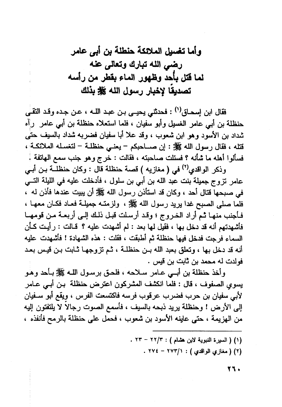 وذكر الواقدي [ (2) ] في (مغازيه) قصة حنظلة قال: وكان حنظلة بن أبي عامر تزوج جميلة بنت عبد اللَّه بن أبي بن سلول، فأدخلت عليه في الليلة التي في صبحها قتال أحد، وكان قد استأذن رسول اللَّه صلّى اللَّه عليه وسلّم أن يبيت عندها فأذن له، فلما صلى الصبح غدا يريد رسول اللَّه صلّى اللَّه عليه وسلّم، ولزمته جميلة فعاد فكان معها، فأجنب منها ثم أراد الخروج، وقد أرسلت قبل ذلك إلى أربعة من قومها فأشهدتهم أنه قد دخل بها، فقيل لها بعد: لم أشهدت عليه؟ قالت: رأيت كان السماء فرجت فدخل فيها حنظلة ثم أطبقت، فقلت: هذه الشهادة! فأشهدت عليه أنه قد دخل بها، وتعلق بعبد اللَّه بن حنظلة، ثم تزوجها ثابت بن قيس بعد فولدت له محمد بن ثابت بن قيس.