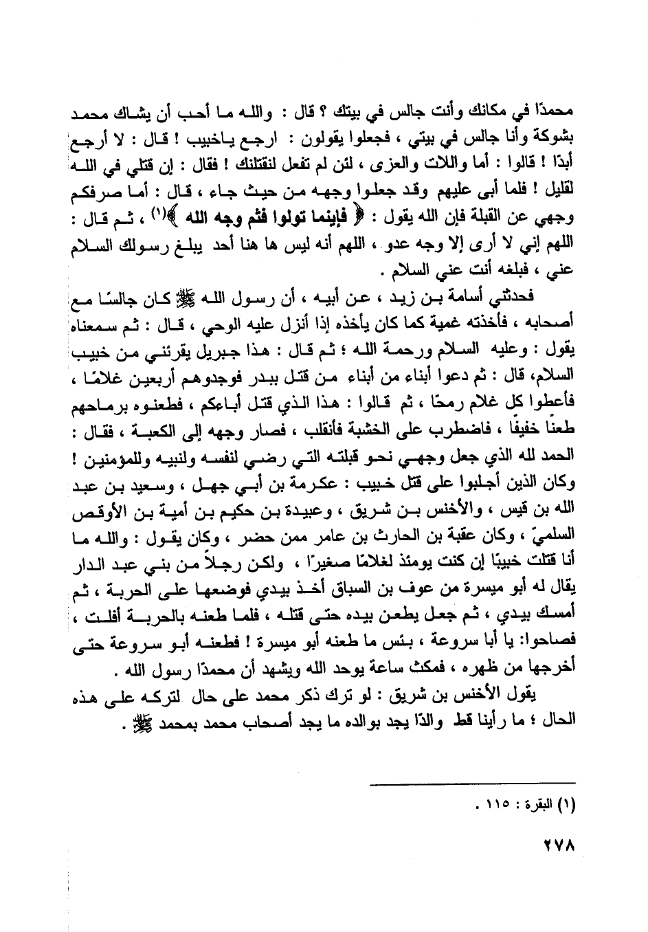 محمدا في مكانك وأنت جالس في بيتك؟ قال: واللَّه ما أحب أن يشاك محمد بشوكة وأنا جالس في بيتي، فجعلوا يقولون: ارجع يا خبيب! قال: لا أرجع أبدا! قالوا: أما واللات والعزى، لئن لم تفعل لنقتلنك! فقال: إن قتلي في اللَّه لقليل! فلما أبى عليهم وقد جعلوا وجهه من حيث جاء، قال: أما صرفكم وجهي عن القبلة فإن اللَّه يقول: فَأَيْنَما تُوَلُّوا فَثَمَّ وَجْهُ اللَّهِ [ (1) ] ، ثم قال: