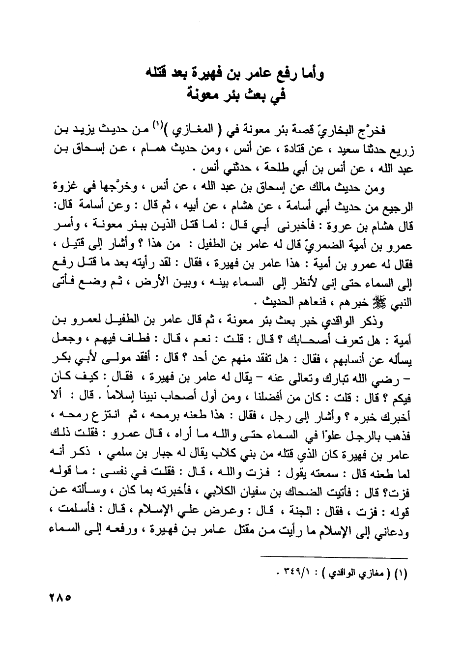 قال هشام بن عروة: فأخبرني أبي قال: لما قتل الذين ببئر معونة، وأسر عمرو بن أمية الضمريّ قال له عامر بن الطفيل: من هذا؟ وأشار إلى قتيل، فقال له عمرو بن أمية: هذا عامر بن فهيرة، فقال: لقد رأيته بعد ما قتل رفع إلى السماء حتى إني لأنظر إلى السماء بينه، وبين الأرض، ثم وضع فأتى النبي صلّى اللَّه عليه وسلّم خبرهم، فنعاهم الحديث.