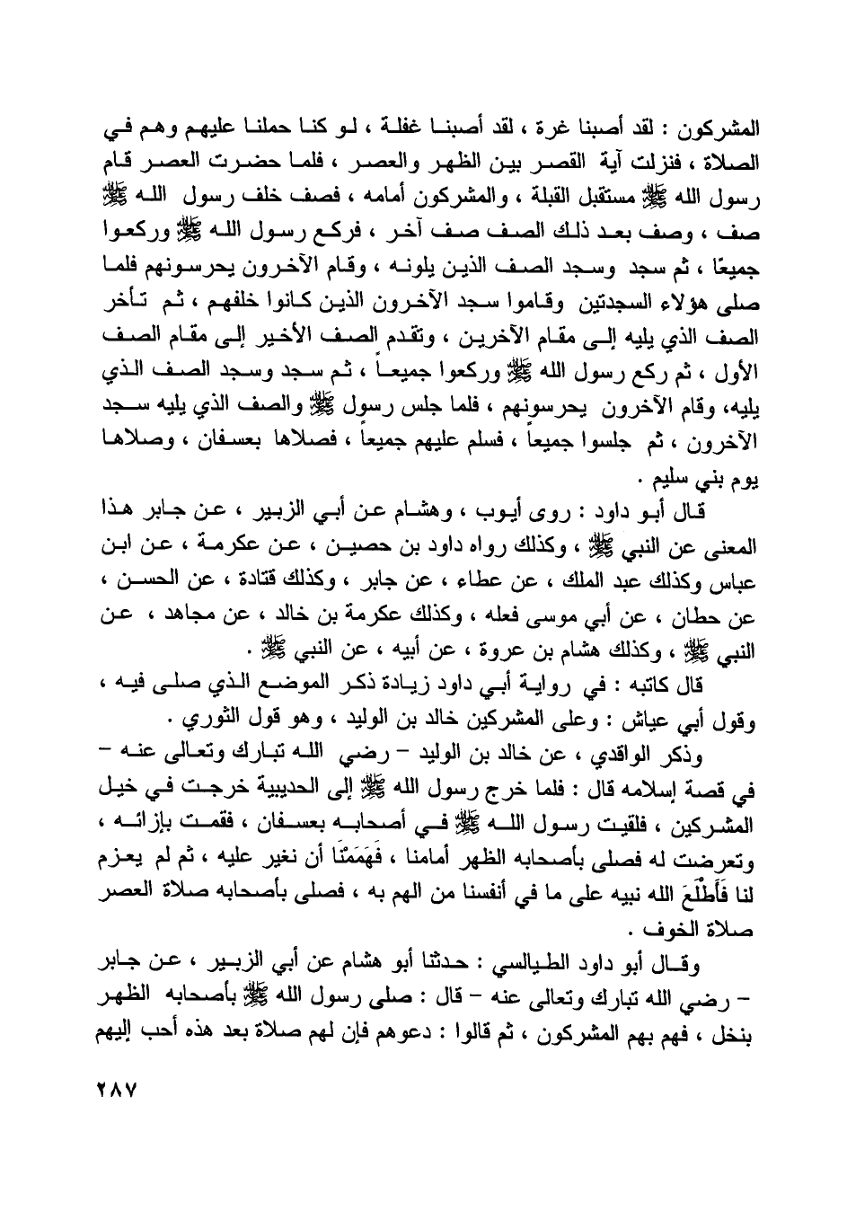 وقال أبو داود الطيالسي: حدثنا أبو هشام عن أبي الزبير، عن جابر- رضي اللَّه تبارك وتعالى عنه- قال: صلى رسول اللَّه صلّى اللَّه عليه وسلّم بأصحابه الظهر بنخل، فهم بهم المشركون، ثم قالوا: دعوهم فإن لهم صلاة بعد هذه أحب إليهم