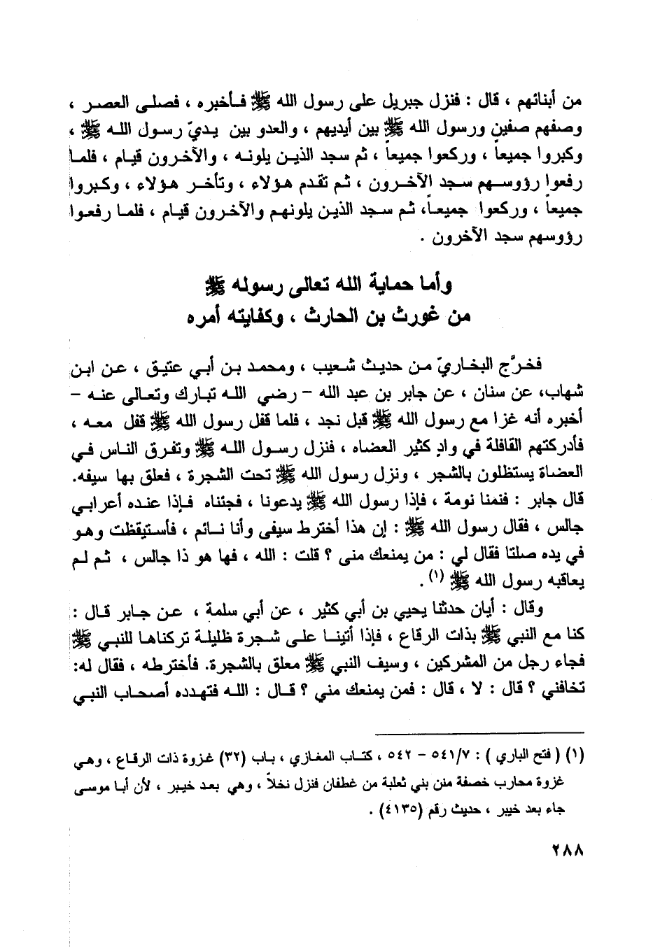 [ (1) ] (فتح الباري) : 7/ 541- 542، كتاب المغازي، باب (32) غزوة ذات الرقاع، وهي غزوة محارب خصفة منن بني ثعلبة من غطفان فنزل نخلا، وهي بعد خيبر، لأن أبا موسى جاء بعد خيبر، حديث رقم (4135) .