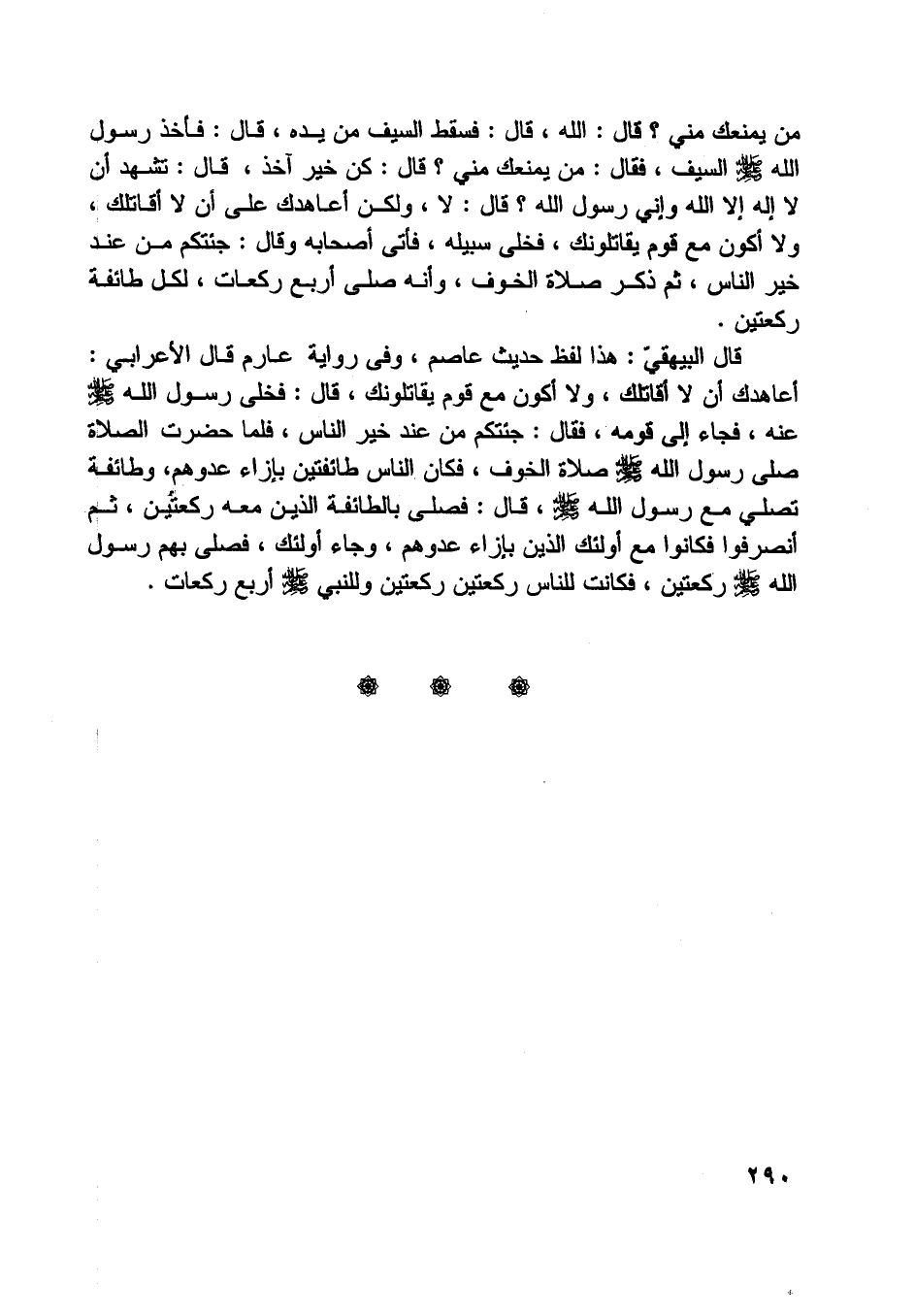 أعاهدك أن لا أقاتلك، ولا أكون مع قوم يقاتلونك، قال: فخلى رسول اللَّه صلّى اللَّه عليه وسلّم عنه، فجاء إلى قومه، فقال: جئتكم من عند خير الناس، فلما حضرت الصلاة صلى رسول اللَّه صلّى اللَّه عليه وسلّم صلاة الخوف، فكان الناس طائفتين بإزاء عدوهم، وطائفة تصلي مع رسول اللَّه صلّى اللَّه عليه وسلّم، قال: فصلى بالطائفة الذين معه ركعتين، ثم انصرفوا فكانوا مع أولئك الذين بإزاء عدوهم، وجاء أولئك، فصلى بهم رسول اللَّه صلّى اللَّه عليه وسلّم ركعتين، فكانت للناس ركعتين ركعتين وللنّبيّ صلّى اللَّه عليه وسلّم أربع ركعات.