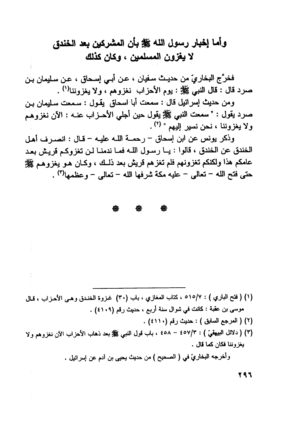 [ (3) ] (دلائل البيهقيّ) : 3/ 457- 458، باب قول النبي صلّى اللَّه عليه وسلّم بعد ذهاب الأحزاب الآن نغزوهم ولا يغزوننا فكان كما قال.