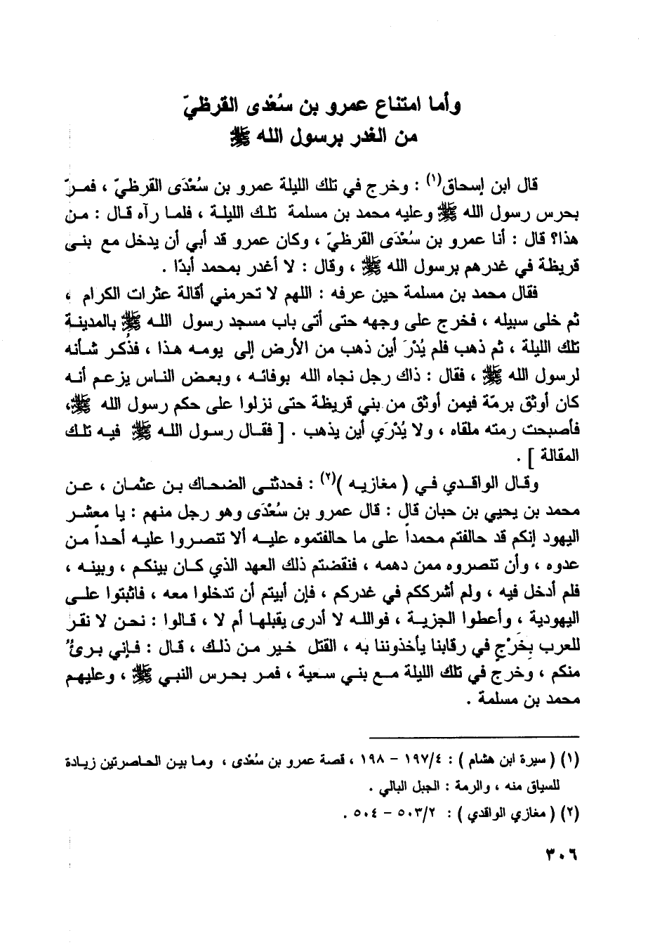 وقال الواقدي في (مغازيه) [ (2) ] : فحدثني الضحاك بن عثمان، عن محمد بن يحيى بن حبان قال: قال عمرو بن سعدى وهو رجل منهم: يا معشر اليهود إنكم قد حالفتم محمدا على ما حالفتموه عليه ألا تنصروا عليه أحدا من عدوه، وأن تنصروه ممن دهمه، فنقضتم ذلك العهد الّذي كان بينكم، وبينه، فلم أدخل فيه، ولم أشرككم في غدركم، فإن أبيتم أن تدخلوا معه، فأثبتوا على اليهودية، وأعطوا الجزية، فو اللَّه لا أدرى يقبلها أم لا، قالوا: نحن لا نقر للعرب بخرج في رقابنا يأخذوننا به، القتل خير من ذلك، قال: فإنّي بري منكم، وخرج في تلك الليلة مع بني سعية، فمر بحرس النبي صلّى اللَّه عليه وسلّم، وعليهم محمد بن مسلمة.