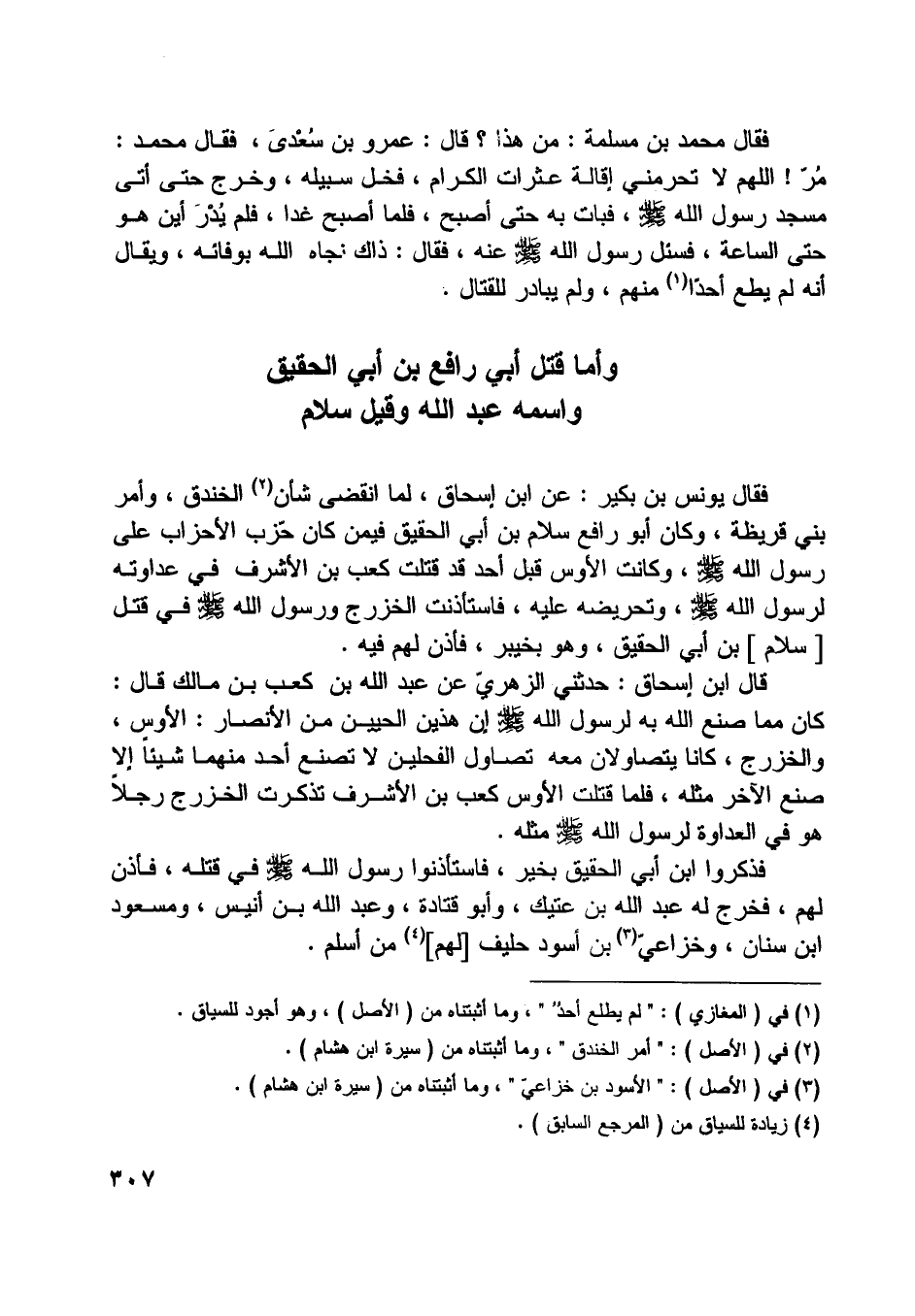 فقال يونس بن بكير: عن ابن إسحاق، لما انقضى شأن [ (2) ] الخندق، وأمر بني قريظة، وكان أبو رافع سلام بن أبي الحقيق فيمن كان حزّب الأحزاب على رسول اللَّه صلّى اللَّه عليه وسلّم، وكانت الأوس قبل أحد قد قتلت كعب بن الأشرف في عداوته لرسول اللَّه صلّى اللَّه عليه وسلّم، وتحريضه عليه، فاستأذنت الخزرج ورسول اللَّه صلّى اللَّه عليه وسلّم في قتل [سلام] بن أبي الحقيق، وهو بخيبر، فأذن لهم فيه.