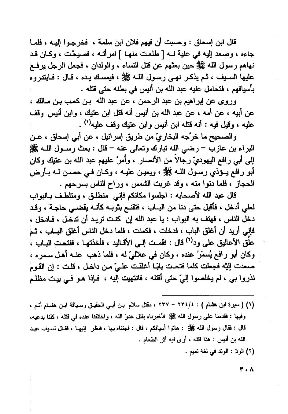 (سيرة ابن هشام) : 4/ 234- 237، مقتل سلام بن أبي الحقيق وسياقة ابن هشام أتم، وفيها: فقدمنا على رسول اللَّه صلّى اللَّه عليه وسلّم فأخبرناه بقتل عدوّ اللَّه، واختلفنا عنده في قتله، كلنا يدعيه، قال: فقال رسول اللَّه صلّى اللَّه عليه وسلّم: هاتوا أسيافكم، قال: فجئناه بها، فنظر إليها، فقال لسيف عبد اللَّه بن أنيس: هذا قتله، أرى فيه أثر الطعام.