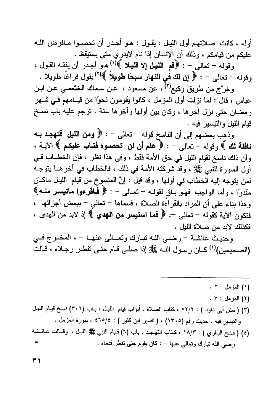 [ (3) ] (سنن أبي داود) : 2/ 72، كتاب الصلاة، أبواب قيام الليل، باب (306) نسخ قيام الليل والتيسير فيه، حديث رقم (1305) ، (تفسير ابن كثير) : 4/ 465، سورة المزمل.