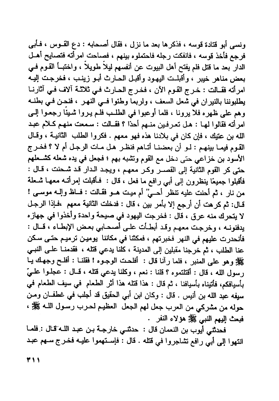 فانحدرت عليهم في النهر فخبرتهم، فمكثنا في مكاننا يومين ترميم حتى سكن عنا الطلب، ثم خرجنا مقبلين إلى المدينة، كلنا يدعي قتله، فقدمنا على النبي صلّى اللَّه عليه وسلّم وهو على المنبر، فلما رآنا قال: أفلحت الوجوه! فقلنا: أفلح وجهك يا رسول اللَّه، قال: أقتلتموه؟ قلنا: نعم، وكلنا يدعي قتله، قال: عجلوا عليّ بأسيافكم، فأتيناه بأسيافنا، ثم قال: هذا قتله هذا أثر الطعام في سيف الطعام في سيفه عبد اللَّه بن أنيس.
