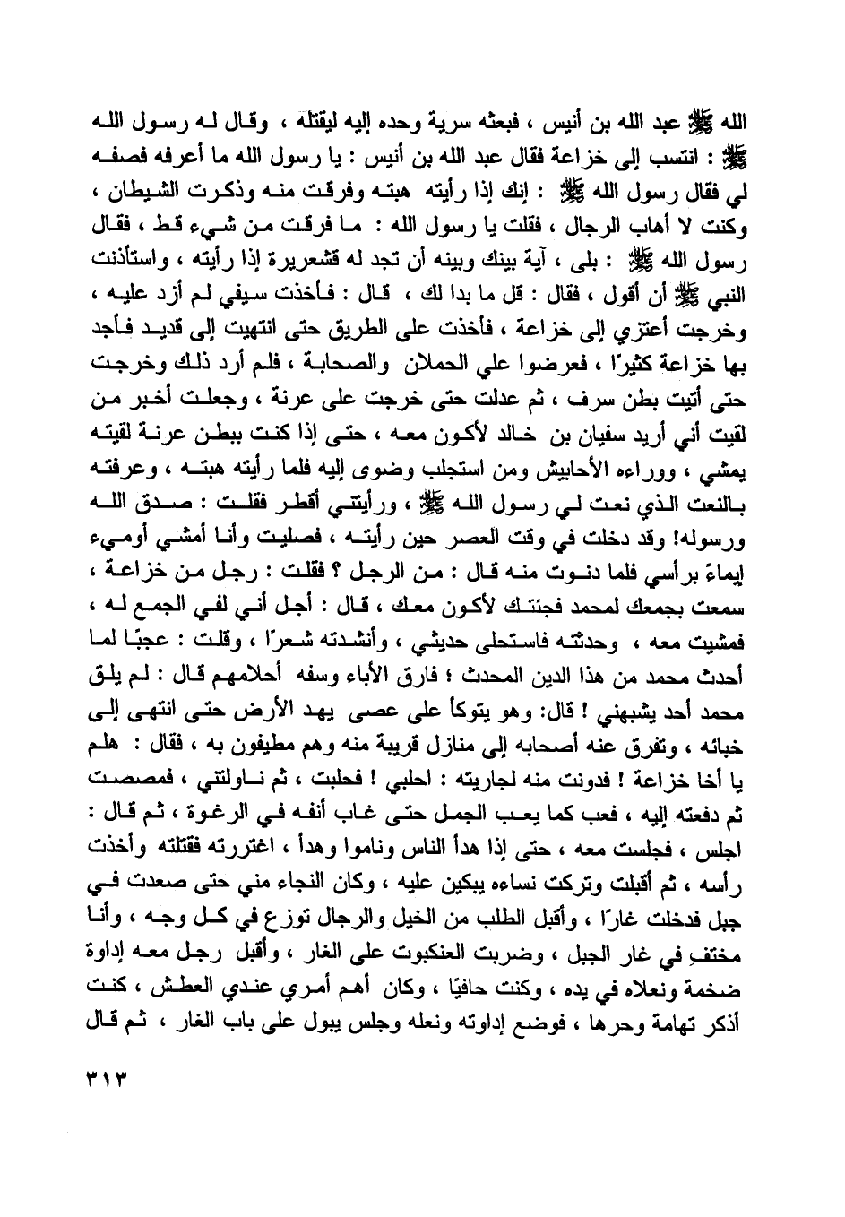 اللَّه صلّى اللَّه عليه وسلّم عبد اللَّه بن أنيس، فبعثه سرية وحده إليه ليقتله، وقال له رسول اللَّه صلّى اللَّه عليه وسلّم: انتسب إلى خزاعة فقال عبد اللَّه بن أنيس: يا رسول اللَّه ما أعرفه فصفه لي فقال رسول اللَّه صلّى اللَّه عليه وسلّم: إنك إذا رأيته هبته وفرقت منه وذكرت الشيطان، وكنت لا أهاب الرجال، فقلت يا رسول اللَّه: ما فرقت من شيء قط، فقال رسول اللَّه صلّى اللَّه عليه وسلّم: بلى، آية بينك وبينه أن تجد له قشعريرة إذا رأيته، واستأذنت النبي صلّى اللَّه عليه وسلّم أن أقول، فقال: قل ما بدا لك،