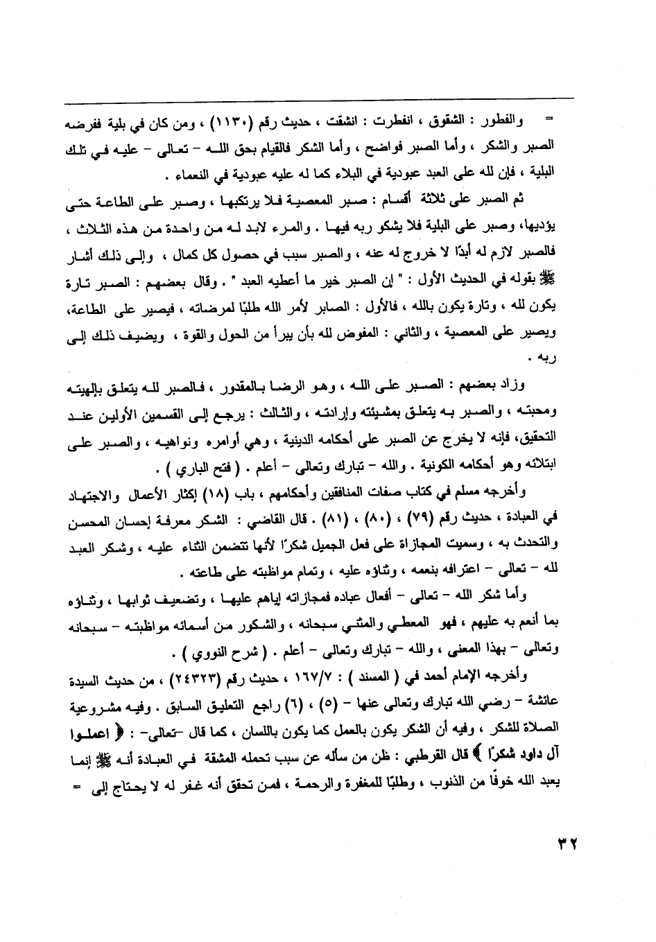 [ () ] والفطور: الشقوق، انفطرت: انشقت، حديث رقم (1130) ، ومن كان في بلية ففرضه الصبر والشكر، وأما الصبر فواضح، وأما الشكر فالقيام بحق اللَّه- تعالى- عليه في تلك البلية، فإن للَّه على العبد عبودية في البلاء كما له عليه عبودية في النعماء.