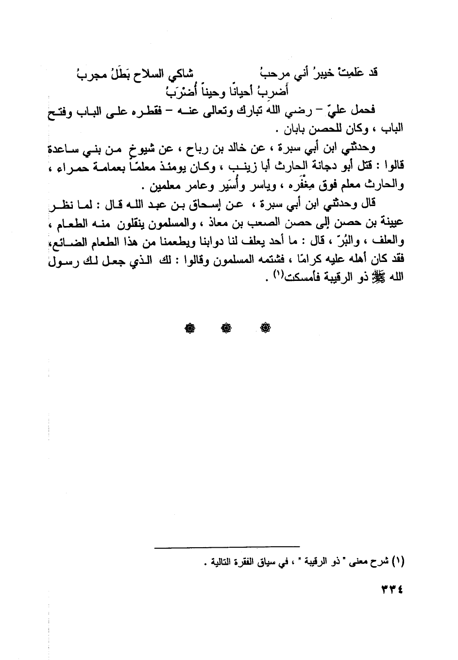 قال وحدثني ابن أبي سبرة، عن إسحاق بن عبد اللَّه قال: لما نظر عيينة بن حصن إلى حصن الصعب بن معاذ، والمسلمون ينقلون منه الطعام، والعلف، والبرّ، قال: ما أحد يعلف لنا دوابنا ويطعمنا من هذا الطعام الضائع، فقد كان أهله عليه كراما، فشتمه المسلمون وقالوا: لك الّذي جعل لك رسول اللَّه صلّى اللَّه عليه وسلّم ذو الرقيبة فأمسكت [ (1) ] .
