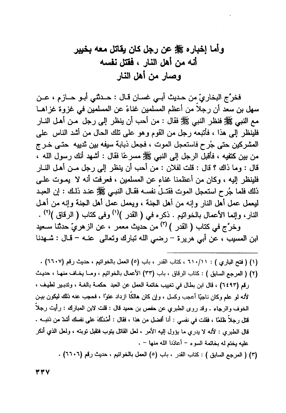[ (1) ] (فتح الباري) : 11/ 610، كتاب القدر، باب (5) العمل بالخواتيم، حديث رقم (6607) .