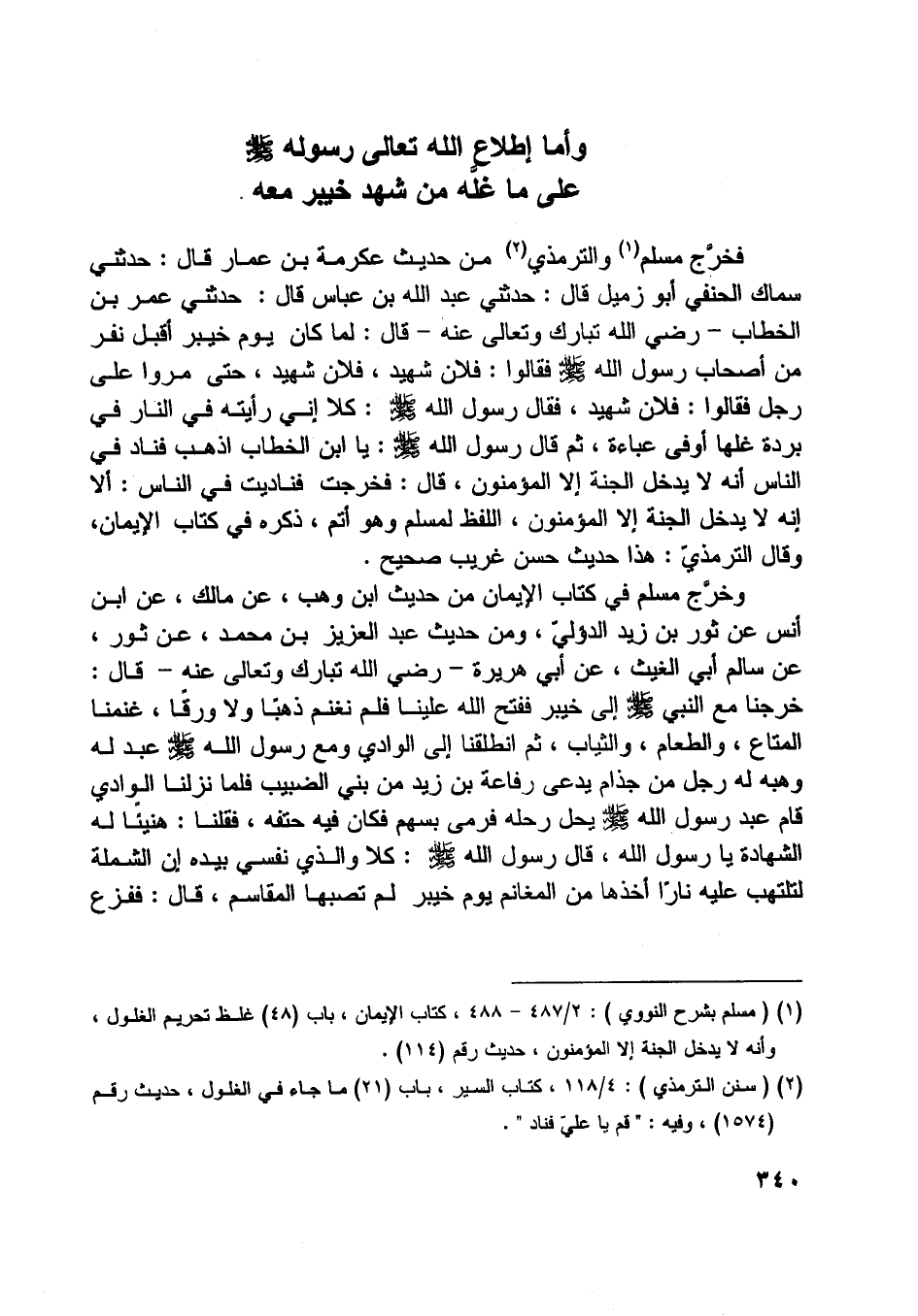 فخرّج مسلم [ (1) ] والترمذي [ (2) ] من حديث عكرمة بن عمار قال: حدثني سماك الحنفي أبو زميل قال: حدثني عبد اللَّه بن عباس قال: حدثني عمر بن الخطاب- رضي اللَّه تبارك وتعالى عنه- قال: لما كان يوم خيبر أقبل نفر من أصحاب رسول اللَّه صلّى اللَّه عليه وسلّم فقالوا: فلان شهيد، فلان شهيد، حتى مروا على رجل فقالوا: فلان شهيد، فقال رسول اللَّه صلّى اللَّه عليه وسلّم: كلا إني رأيته في النار في بردة غلها أوفى عباءة، ثم قال رسول اللَّه صلّى اللَّه عليه وسلّم: يا ابن الخطاب اذهب فناد في الناس أنه لا يدخل الجنة إلا المؤمنون، قال: فخرجت فناديت في الناس: ألا إنه لا يدخل الجنة إلا المؤمنون، اللفظ لمسلم وهو أتم، ذكره في كتاب الإيمان، وقال الترمذيّ: هذا حديث حسن غريب صحيح.