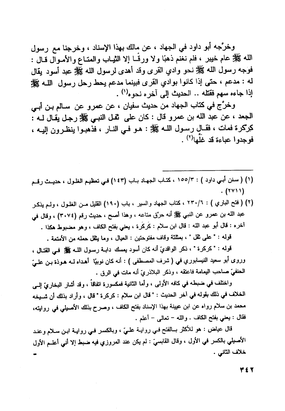 [ (2) ] (فتح الباري) : 6/ 230، كتاب الجهاد والسير، باب (190) القليل من الغلول، ولم يذكر عبد اللَّه بن عمرو عن النبي صلّى اللَّه عليه وسلّم أنه حرّق متاعه، وهذا أصح، حديث رقم (3074) ، وقال في آخره: قال أبو عبد اللَّه: قال ابن سلام: كركرة، يعني بفتح الكاف، وهو مضبوط هكذا.
