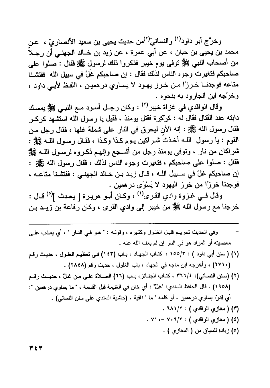 [ (2) ] (سنن النسائي) : 4/ 366، كتاب الجنائز، باب (66) الصلاة على من غلّ، حديث رقم (1958) . قال الحافظ السندي: «غل» : أي خان في الغنيمة قبل القسمة، «ما يساوي درهمين» :