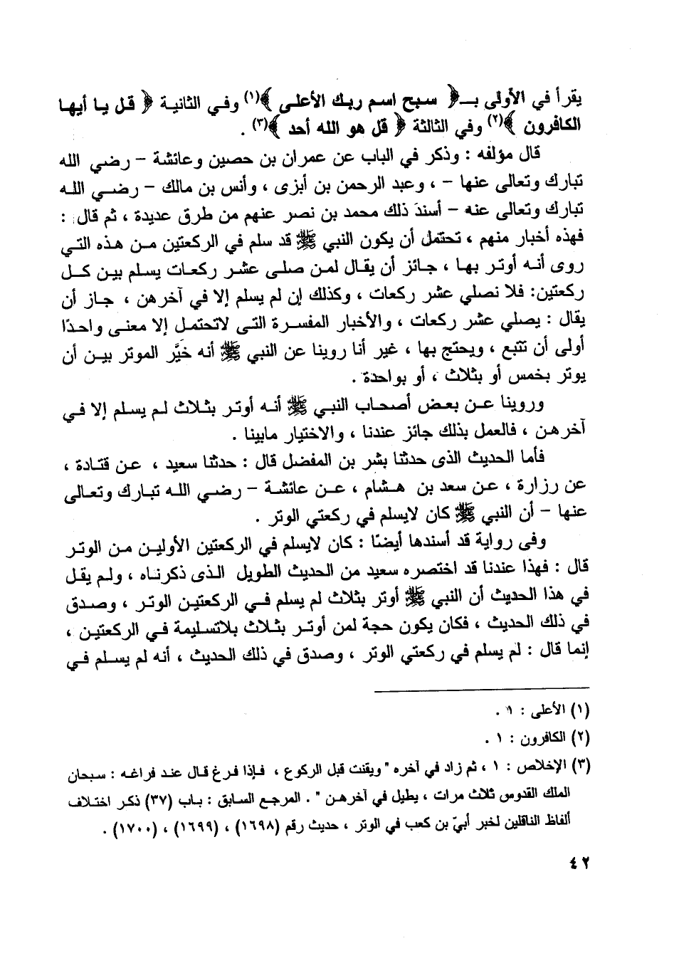 وروينا عن بعض أصحاب النبي صلّى اللَّه عليه وسلّم أنه أوتر بثلاث لم يسلم إلا في آخرهن، فالعمل بذلك جائز عندنا، والاختيار ما بينا.
