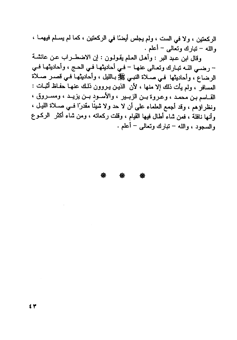 القاسم بن محمد، وعروة بن الزبير، والأسود بن يزيد، ومسروق، ونظراؤهم، وقد أجمع العلماء على أن لا حد ولا شيئا مقدرا في صلاة الليل، وأنها نافلة، فمن شاء أطال فيها القيام، وقلت ركعاته، ومن شاء أكثر الركوع والسجود، واللَّه- تبارك وتعالى- أعلم.