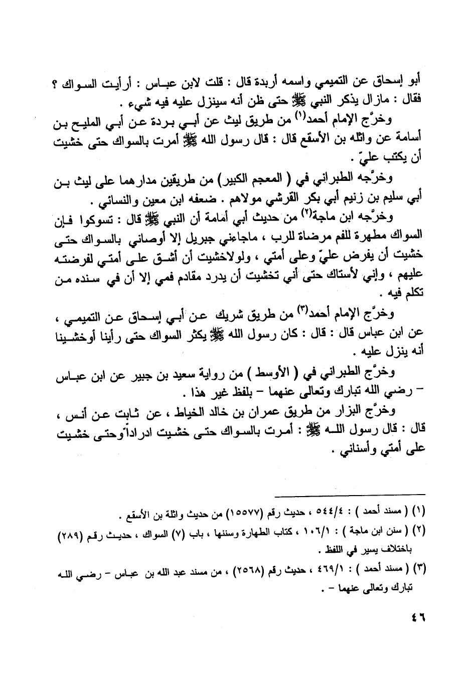 وخرّج الإمام أحمد [ (3) ] من طريق شريك عن أبي إسحاق عن التميمي، عن ابن عباس قال: قال: كان رسول اللَّه صلّى اللَّه عليه وسلّم يكثر السواك حتى رأينا أو خشينا أنه ينزل عليه.