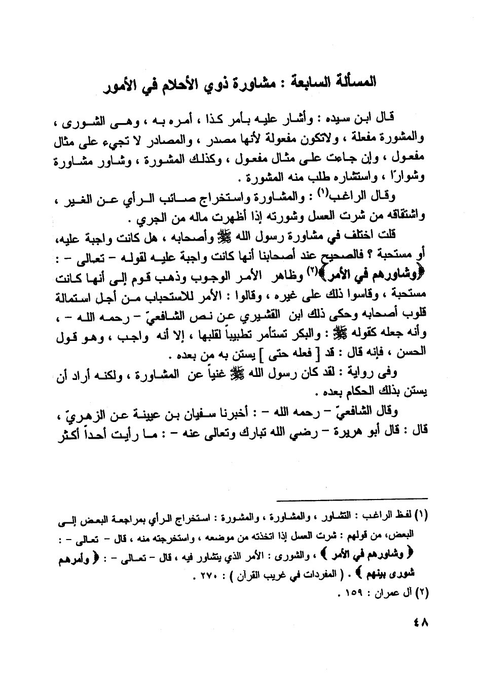 [ (1) ] لفظ الراغب: التشاور، والمشاورة، والمشورة: استخراج الرأي بمراجعة البعض إلى البعض، من قولهم: شرت العسل إذا اتخذته من موضعه، واستخرجته منه، قال- تعالى-: