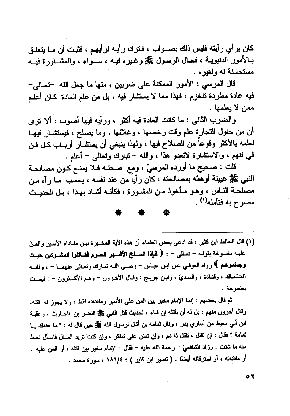 وزاد الشافعيّ- رحمة اللَّه عليه- فقال: الإمام مخير بين قتله، أو المن عليه، أو مفاداته، أو استرقاقه أيضا. (تفسير ابن كثير) : 4/ 186، سورة محمد.