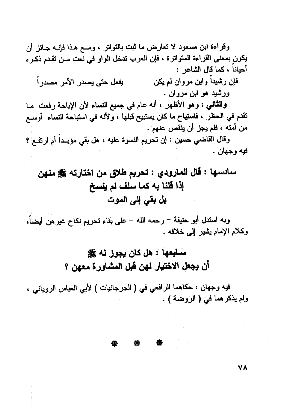 سادسها: قال الماوردي: تحريم طلاق من اختارته صلّى اللَّه عليه وسلّم منهن إذا قلنا به كما سلف لم ينسخ بل بقي إلى الموت