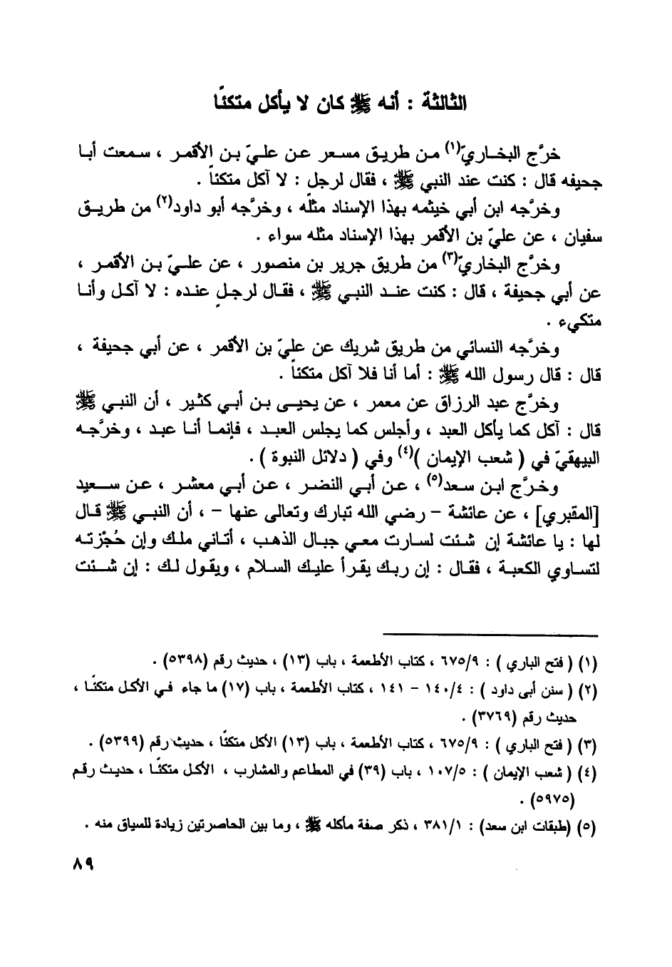 [ (3) ] (فتح الباري) : 9/ 675، كتاب الأطعمة، باب (13) الأكل متكئا، حديث رقم (5399) .
