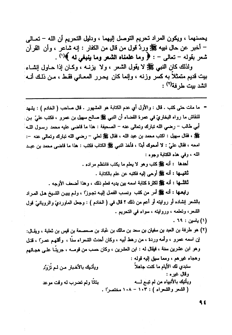 ولذلك كان النبي صلّى اللَّه عليه وسلّم لا يقول الشعر، ولا يزنه، وكان إذا حاول إنشاء بيت قديم متمثلا به كسر وزنه، وإنما كان يحرر المعاني فقط، من ذلك أنه انشد بيت طرفة [ (2) ] :