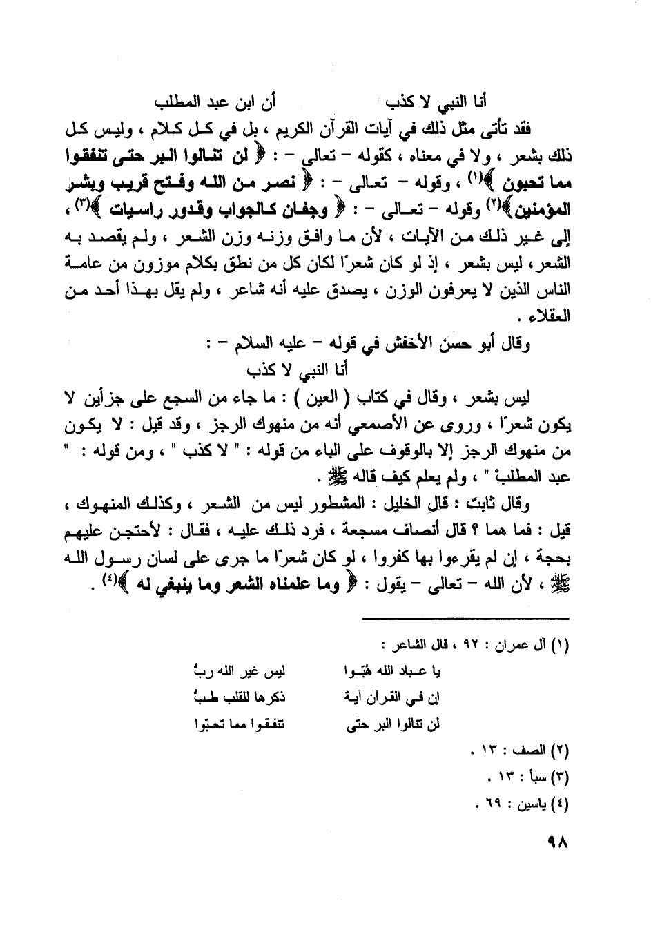 ليس بشعر، وقال في كتاب (العين) : ما جاء من السجع على جزأين لا يكون شعرا، وروى عن الأصمعي أنه من منهوك الرجز، وقد قيل: لا يكون من منهوك الرجز إلا بالوقوف على الباء من قوله: «لا كذب» ، ومن قوله: «عبد المطلب» ، ولم يعلم كيف قاله صلّى اللَّه عليه وسلّم.
