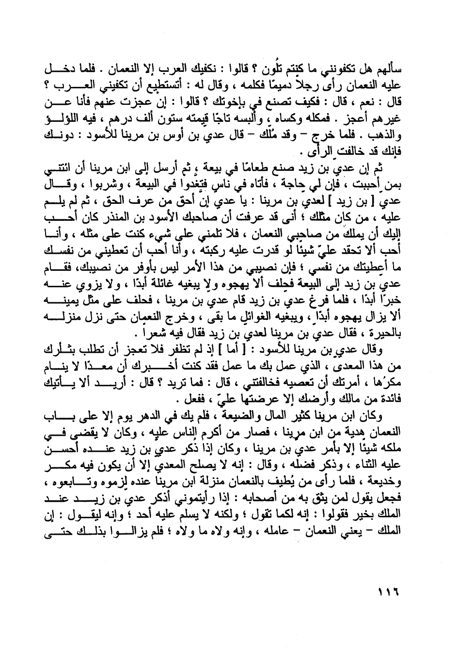 ثم إن عديّ بن زيد صنع طعاما في بيعة، ثم أرسل إلى ابن مرينا أن ائتني بمن أحببت، فإن لي حاجة، فأتاه في ناس فتغدّوا في البيعة، وشربوا، وقال عديّ [بن زيد] لعدي بن مرينا: يا عدي إن أحق من عرف الحق، ثم لم يلم عليه، من كان مثلك، أنى قد عرفت أن صاحبك الأسود بن المنذر كان أحب إليك أن يملك من صاحبي النعمان، فلا تلمني على شيء كنت على مثله، وأنا أحب ألا تحقد عليّ شيئا لو قدرت عليه ركبته، وأنا أحب أن تعطيني من نفسك ما أعطيتك من نفسي، فإن نصيبي من هذا الأمر ليس بأوفر من نصيبك، فقام عديّ بن زيد إلى البيعة فحلف ألا يهجوه ولا يبغيه غائلة أبدا، ولا يزوي عنه خبرا أبدا، فلما فرغ عديّ بن زيد قام عدي بن مرينا، فحلف على مثل يمينه ألا يزال يهجوه أبدا، ويبغيه الغوائل ما بقي، وخرج النعمان حتى نزل منزله بالحيرة، فقال عديّ بن مرينا لعديّ بن زيد فقال فيه شعرا.