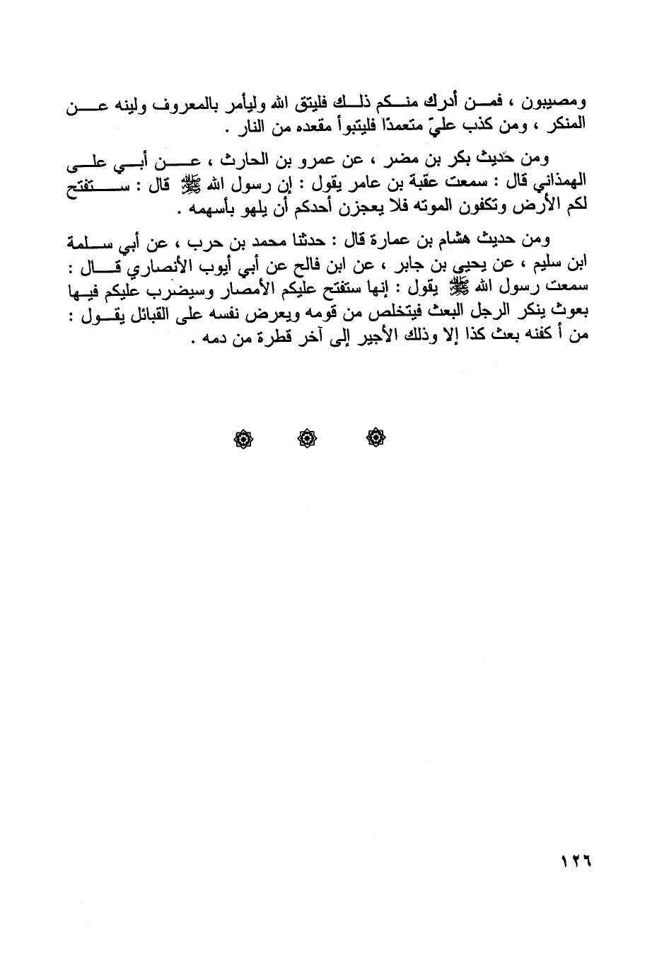 ومن حديث هشام بن عمارة قال: حدثنا محمد بن حرب، عن أبي سلمة ابن سليم، عن يحيى بن جابر، عن ابن فألح عن أبي أيوب الأنصاري قال: سمعت رسول اللَّه صلّى اللَّه عليه وسلّم يقول: إنها ستفتح عليكم الأمصار وسيضرب عليكم فيها بعوث ينكر الرجل البعث فيتخلص من قومه ويعرض نفسه على القبائل يقول: