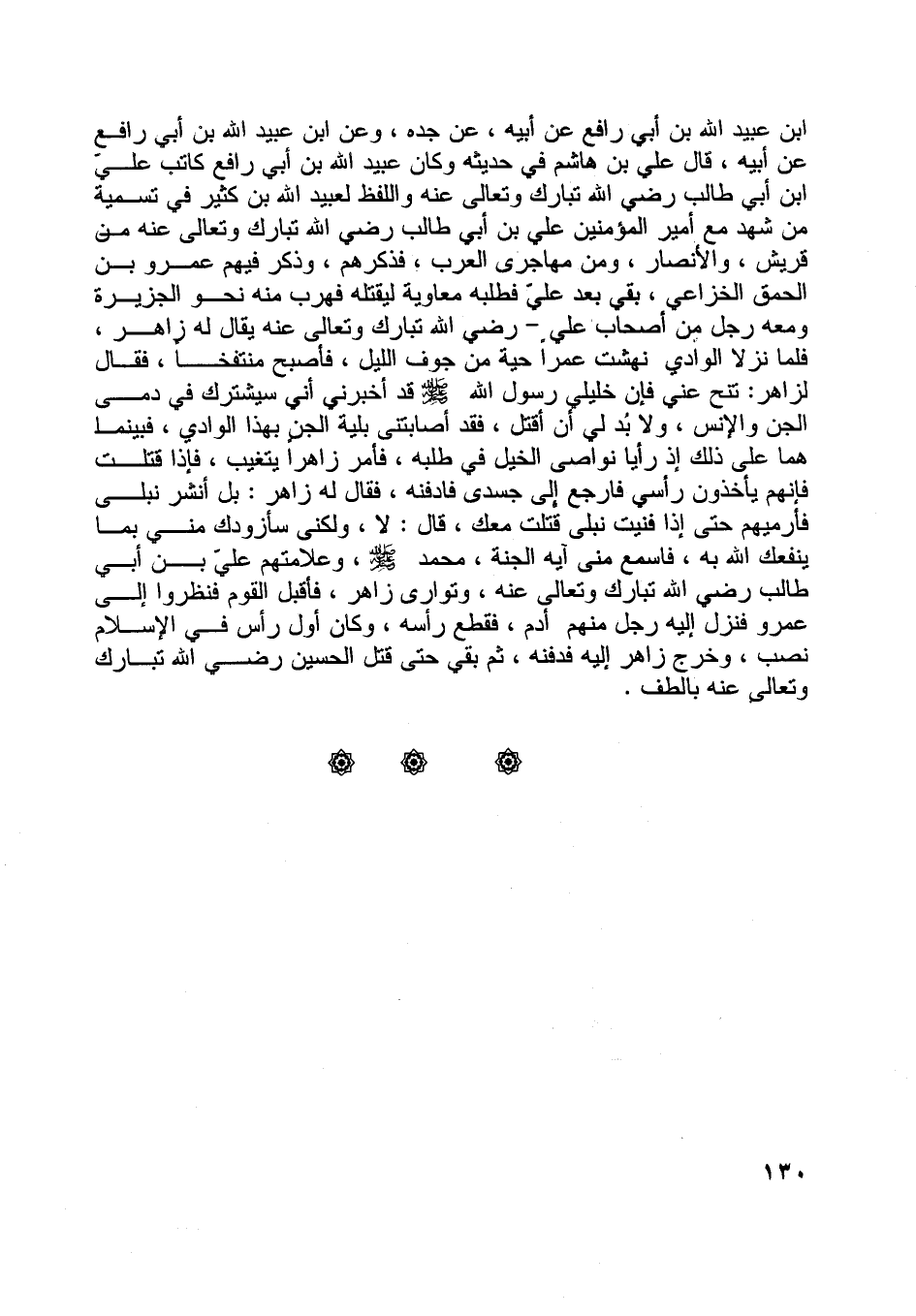 ابن عبيد اللَّه بن أبي رافع عن أبيه، عن جده، وعن ابن عبيد اللَّه بن أبي رافع عن أبيه، قال علي بن هاشم في حديثه وكان عبيد اللَّه بن أبي رافع كاتب عليّ ابن أبي طالب رضي اللَّه تبارك وتعالى عنه واللفظ لعبيد اللَّه بن كثير في تسمية من شهد مع أمير المؤمنين علي بن أبي طالب رضي اللَّه تبارك وتعالى عنه من قريش، والأنصار، ومن مهاجري العرب، فذكرهم، وذكر فيهم عمرو بن الحمق الخزاعي، بقي بعد عليّ فطلبه معاوية ليقتله فهرب منه نحو الجزيرة ومعه رجل من أصحاب علي- رضي اللَّه تبارك وتعالى عنه يقال له زاهر، فلما نزلا الوادي نهشت عمرا حية من جوف الليل، فأصبح منتفخا،
