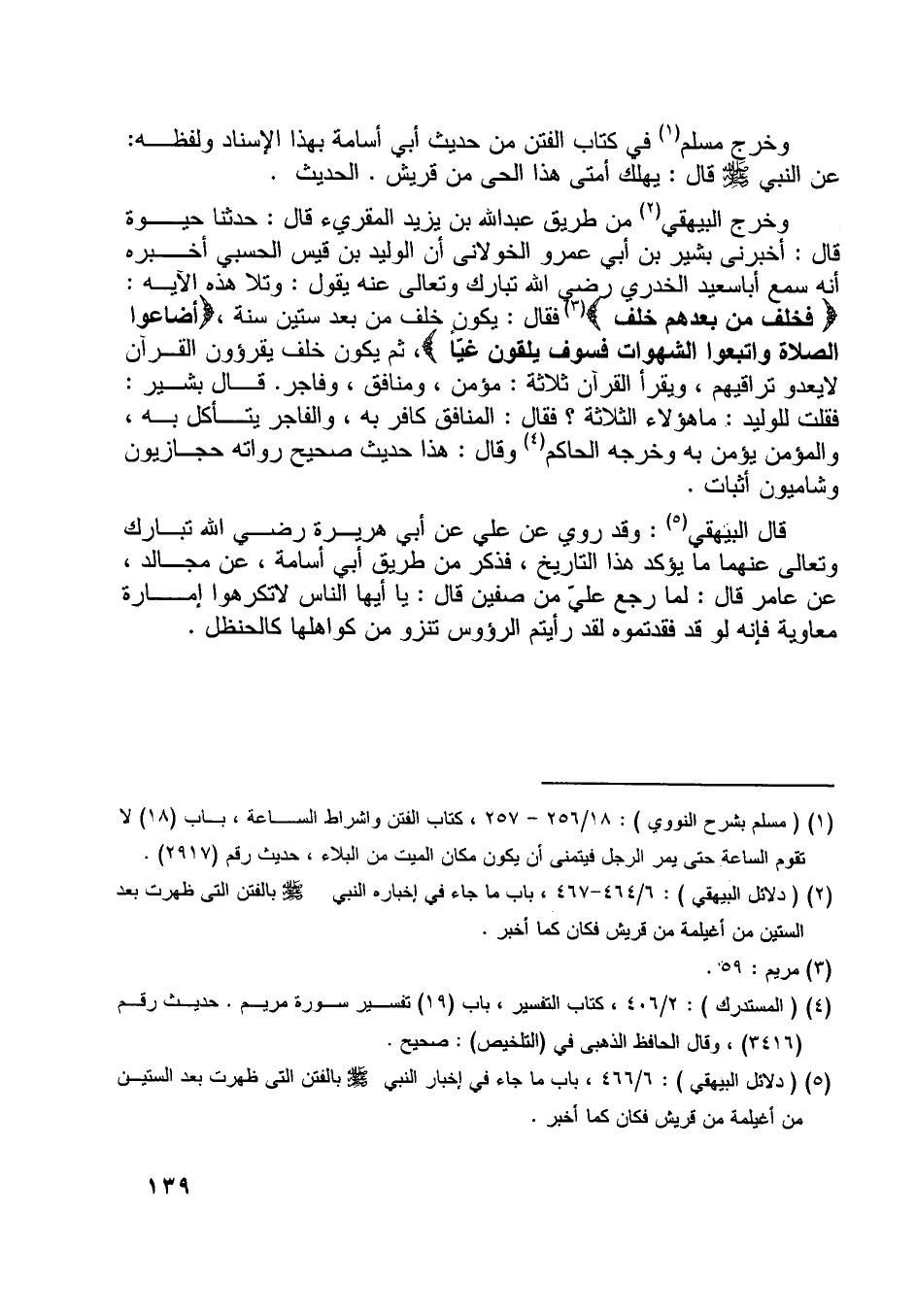 [ (5) ] (دلائل البيهقي) : 6/ 466، باب ما جاء في إخبار النبي صلى اللَّه عليه وسلّم بالفتن التي ظهرت بعد الستين من أغيلمة من قريش فكان كما أخبر.