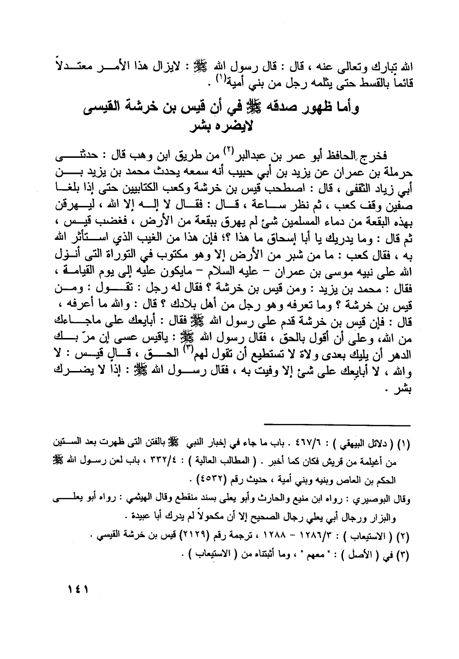 قال: فإن قيس بن خرشة قدم على رسول اللَّه صلّى اللَّه عليه وسلّم فقال: أبايعك على ما جاءك من اللَّه، وعلى أن أقول بالحق، فقال رسول اللَّه صلّى اللَّه عليه وسلّم: يا قيس عسى إن مرّ بك الدهر أن يليك بعدي ولاة لا تستطيع أن تقول لهم [ (3) ] الحق، قال قيس: لا واللَّه، لا أبايعك على شيء إلا وفيت به، فقال رسول اللَّه صلّى اللَّه عليه وسلّم: إذا لا يضرك بشر.