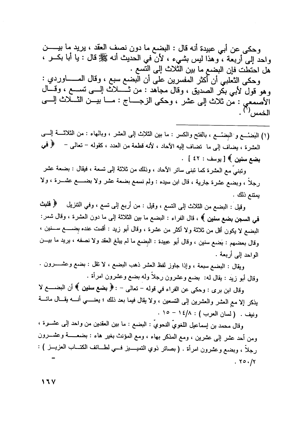 وقال ابن بري: وحكى عن الفراء في قوله- تعالى-: بِضْعِ سِنِينَ أن البضع لا يذكر إلا مع العشر والعشرين إلى التسعين، ولا يقال فيما بعد ذلك، يعني أنه يقال مائة ونيف. (لسان العرب) : 8/ 14- 15.