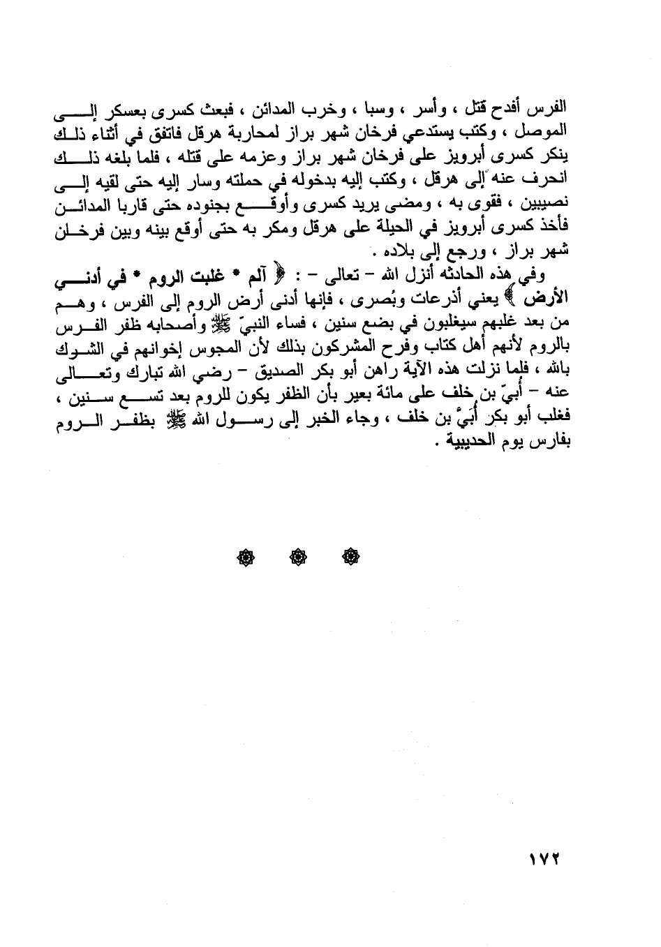 وفي هذه الحادثة أنزل اللَّه- تعالى-: الم* غُلِبَتِ الرُّومُ* فِي أَدْنَى الْأَرْضِ يعني أذرعات وبصرى، فإنّها أدنى أرض الروم إلى الفرس، وهم من بعد غلبهم سيغلبون في بضع سنين، فساء النبيّ صلّى اللَّه عليه وسلّم وأصحابه ظفر الفرس بالروم لأنهم أهل كتاب وفرح المشركون بذلك لأن المجوس إخوانهم في الشرك باللَّه، فلما نزلت هذه الآية راهن أبو بكر الصديق- رضي اللَّه تبارك وتعالى عنه- أبيّ بن خلف على مائة بعير بأن الظفر يكون للروم بعد تسع سنين، فغلب أبو بكر أبيّ بن خلف، وجاء الخبر إلى رسول اللَّه صلّى اللَّه عليه وسلّم بظفر الروم بفارس يوم الحديبيّة.