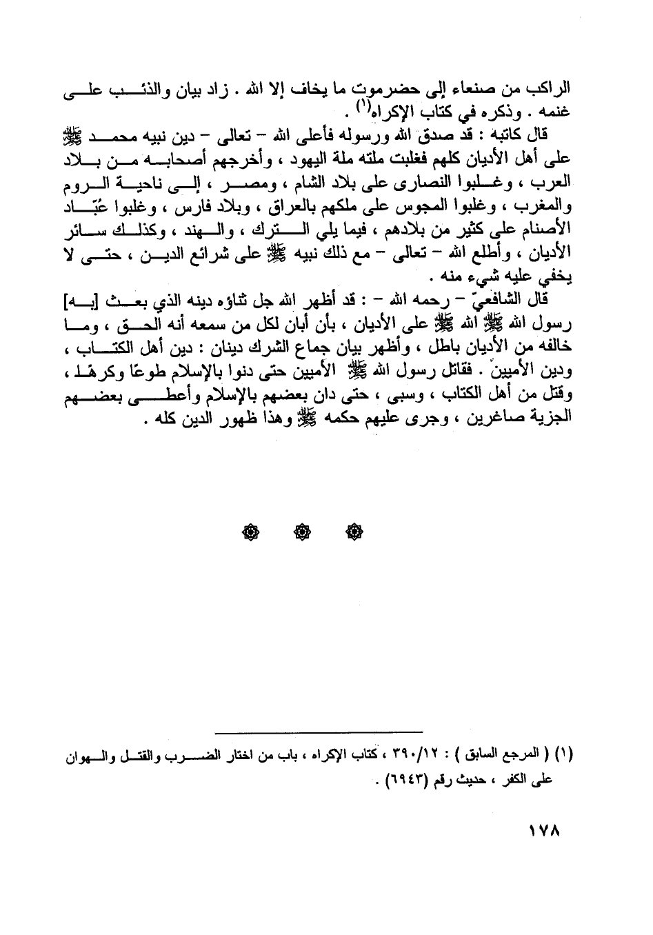 قال الشافعيّ- رحمه اللَّه-: قد أظهر اللَّه جل ثناؤه دينه الّذي بعث [به] رسول اللَّه صلّى اللَّه عليه وسلّم اللَّه صلّى اللَّه عليه وسلّم على الأديان، بأن أبان لكل من سمعه أنه الحق، وما خالفه من الأديان باطل، وأظهر بيان جماع الشرك دينان: دين أهل الكتاب، ودين الأميين. فقاتل رسول اللَّه صلّى اللَّه عليه وسلّم الأميين حتى دنوا بالإسلام طوعا وكرها، وقتل من أهل الكتاب، وسبى، حتى دان بعضهم بالإسلام وأعطى بعضهم الجزية صاغرين، وجرى عليهم حكمه صلّى اللَّه عليه وسلّم وهذا ظهور الدين كله.